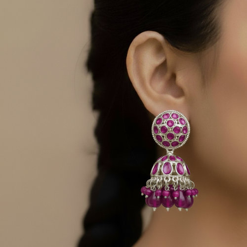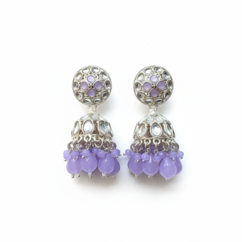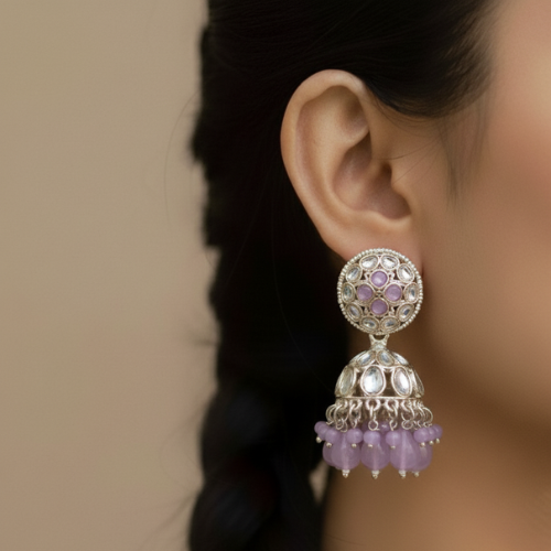 jhumka is adorned with a fringe of delicate, dangling lilac beads, adding a vibrant pop of colour
